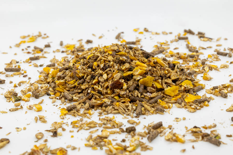Gerste, Mais, Weizenkleie, Gerste flockiert, Mais flockiert, Rübentrockenschnitzel, Apfeltrester, Rübenmelasse, Apfeltrester, Calciumcarbonat, Natriumchlorid, Sojaöl