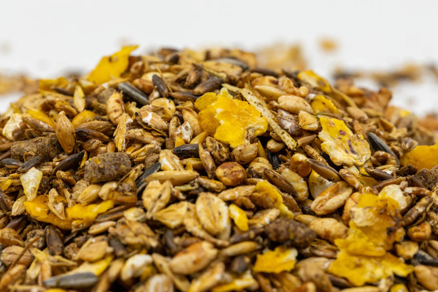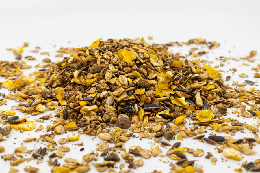 Gerste flockiert, Schwarzhafer, Mais flockiert, Weizen flockiert, Hafer, Mais gepoppt, Gerste gepoppt, Sojabohnen (getoastet), Rübenmelasse, Sonnenblumenkerne, Leinsaat extrudiert, Calciumcarbonat, Monocalziumphosphat, Weizen, Sojaöl,Rübentrockenschnitzel, Natriumchlorid, Magnesiumoxyd, Weizenkleie
