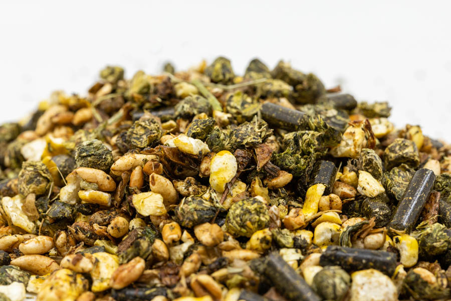 Luzernegrünmehl, Grasflocken, Gerste gepoppt, Apfeltrester, Gerste flockiert, Weizenkleie, Rübenmelasse, Mais gepoppt, Leinsaat extrudiert, Hafer, Erbsenflocken, Rübentrockenschnitzel, Calciumcarbonat, Gerste, Apfeltrester, Sojaöl,Monocalziumphosphat, Weizen, Natriumchlorid, Magnesiumoxyd