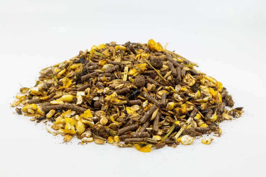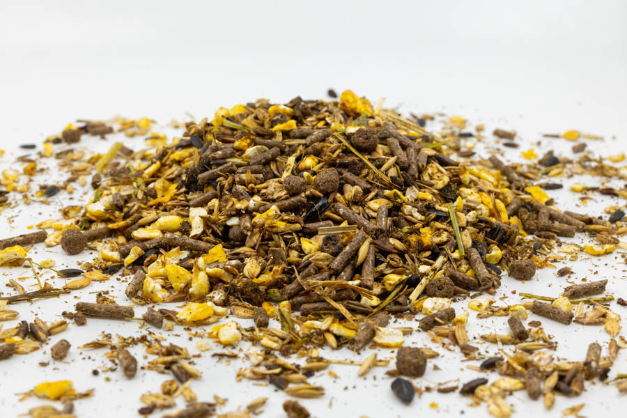 Gerste flockiert, Weizenkleie, Schwarzhafer, Mais gepoppt, Hafer, Mais flockiert, Gerste, Rübentrockenschnitzel, Apfeltrester, Rübenmelasse, Apfeltrester, Calciumcarbonat, Sonnenblumenkerne, Luzernestängel, Leinsaat extrudiert, KräutersamenFruchtmischung (Mariendistelsamen, Schwarzkümmelsamen, Rote Beete Flocken, Brennnesselkraut), Sojaöl, Natriumchlorid
