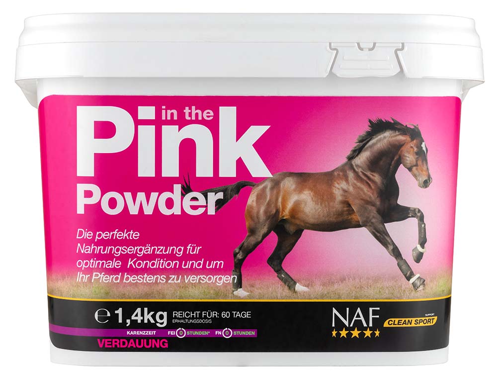 Der Darm ist der Grundstein für die Gesundheit und Vitalität ihres Pferdes. Heutzutage kann ein Pferdeleben durch industriell verarbeitetes Futter, häufiges Reisen und die Teilnahme an Wettkämpfen oftmals mit großer Anspannung und/oder mit metabolischem Stress verbunden sein. Dies kann mitunter zu Konditionsdefiziten führen. In the Pink Powder ist eines der hochwertigsten und modernsten Produkte auf dem Markt, um die Ernährung von Sport- und Freizeitpferden grundlegend zu verbessern. Ein einzigartiges, konzentriertes Ergänzungsfutter mit aktiver Hefe und Probiotika, das zur Ankurbelung der Verdauungsfunktionen und eines natürlichen Verdauungsprozesses entwickelt wurde. Dadurch ist Ihr Pferd in der Lage sein Futter bestmöglich zu verwerten und eine optimale Kondition aufrecht zu erhalten. Darüber hinaus enthält in the Pink Powder hochwertige Vitamine, Mineralstoffe und Mikronährstoffe zur Unterstützung der Gesundheit, Vitalität und Leistungsfähigkeit.